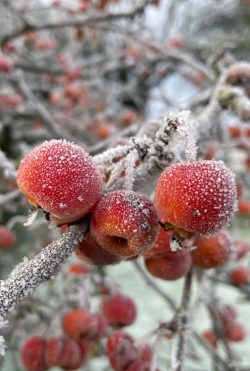 In early autumn, the tree produces blush-red fruits. These crab apples are ideal for making jelly, tarts or preserves. You can also leave them on the tree as a delightful treat for wild birds. They add extra charm to the garden throughout the colder months.