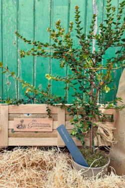 Beautifully presented in one of our wooden crates, this living gift is ideal for special occasions. Inside, they will find a Chilean guava plant – a neat evergreen with shiny leaves. In spring, it has pretty white flowers. Later in summer, it grows small bright berries that taste like wild strawberries.