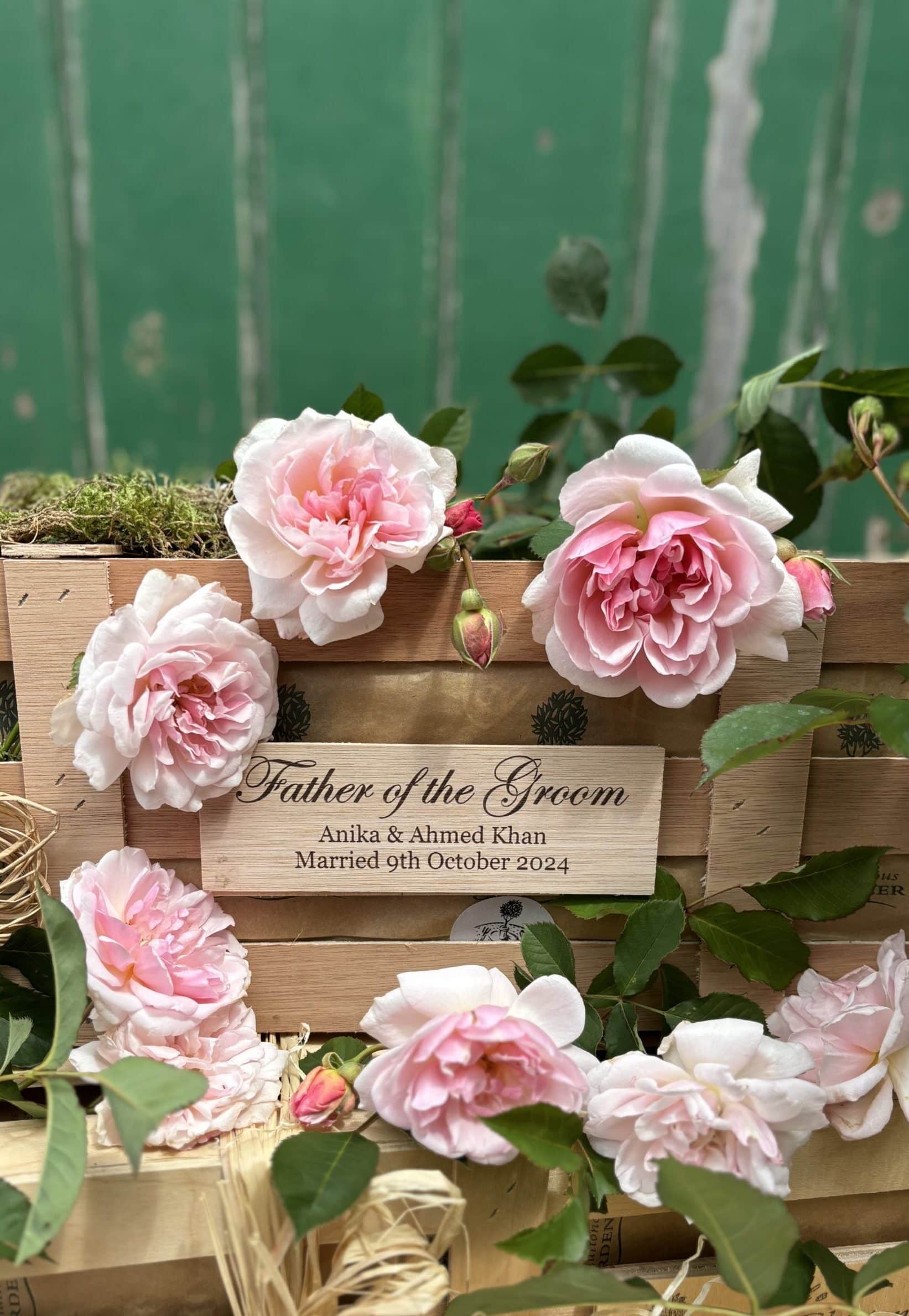A unique and long-lasting gift to thank the father of the groom for his love and support – a personalised crate containing a young rose bush.