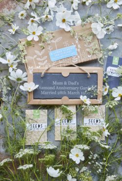 Inside a beautifully decorated presentation box, the special couple will find a trio of seed packets to grow a collection of stunning white flowers – lady’s lace, cosmos and white beeblossom. Also included is a large personalised slate to hang alongside their flourishing garden.