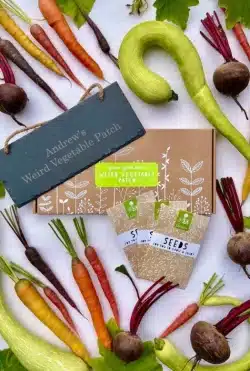 Inside a beautifully decorated presentation box, the recipient will find a trio of seed packets to grow unusual varieties of garden vegetables, together with a large personalised slate to hang alongside their extraordinary veg patch.