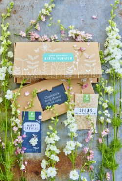 Open the beautifully decorated presentation box to find a packet of larkspur seeds. You’ll also see a smart slate engraved with their name and birth date. They can hang it proudly in the garden as the flowers bloom.