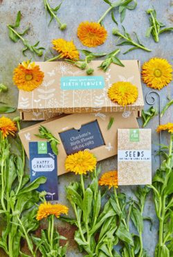 Inside a beautifully decorated presentation box, the lucky recipient will find a packet of marigold seeds and a smart slate engraved with their name and birth date to hang in their flourishing garden.