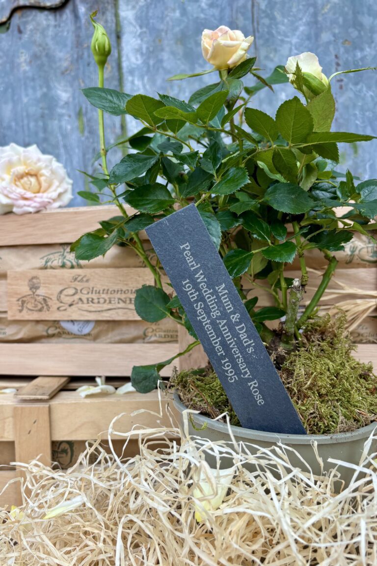 Inside the wooden crate, the happy couple will find a healthy rose bush which will flower with stunning blooms, year after year, as a symbol of their lasting devotion to one another. Nestled alongside the rose is a personalised slate plant stake engraved with their names and those very special dates.