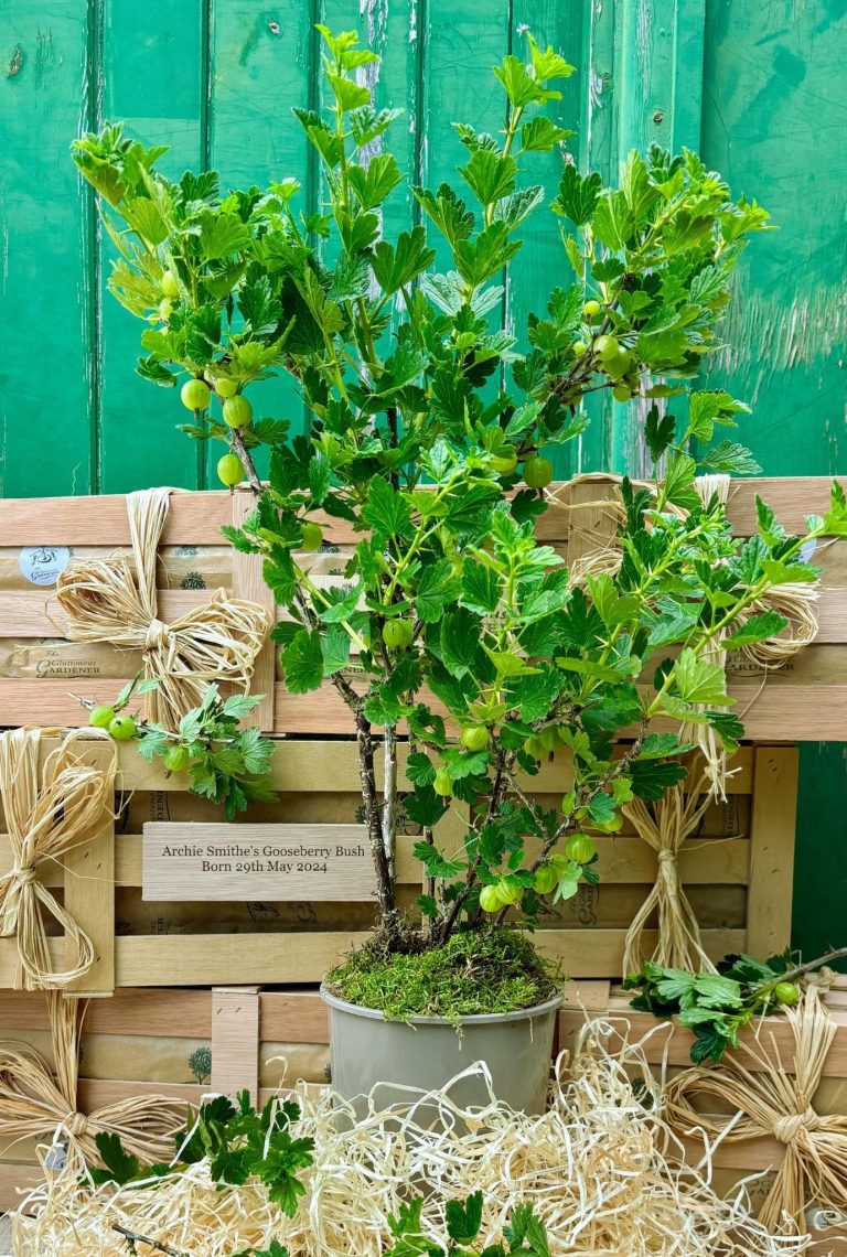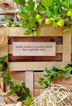 The gooseberry bush will be carefully wrapped in wood wool and packed into a handsome wooden crate, personalised with the name and date of the precious newborn.