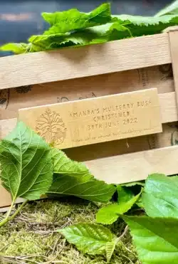 This beautiful and unique baby present contains a healthy young mulberry tree which will serve as a vibrant and lasting token of this most joyful occasion.