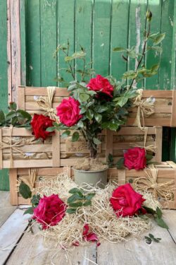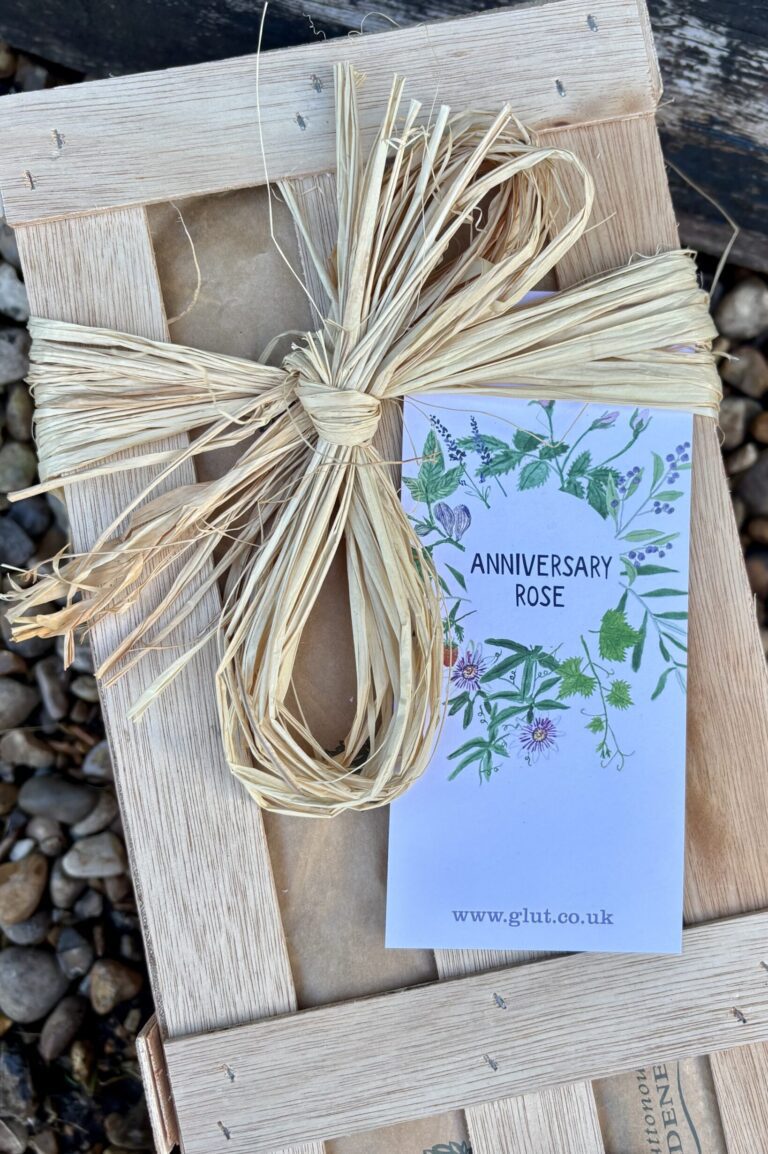 Inside the wooden crate the happy couple will find a young rose bush. It will soon flower with stunning blooms year after year, symbolising their lasting devotion.