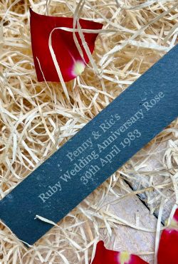 A personalised slate plant stake sits beside the rose. We engrave their names and those very special dates on it.