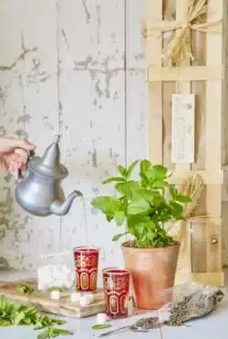 Inside a handsome wooden crate, we’ll carefully pack a beautiful true Moroccan mint plant in a terracotta pot, together with a pair of Moroccan tea glasses and a generous supply of green tea. Full care instructions and recipes are provided, making it easy for the lucky recipient to brew the perfect Kasbah cuppa!