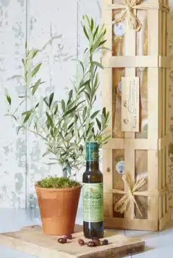 The wooden crate contains a young olive tree in a handsome terracotta pot, neatly tucked up in a bed of wood wool, and accompanied by a bottle of the finest organic extra-virgin olive oil.
