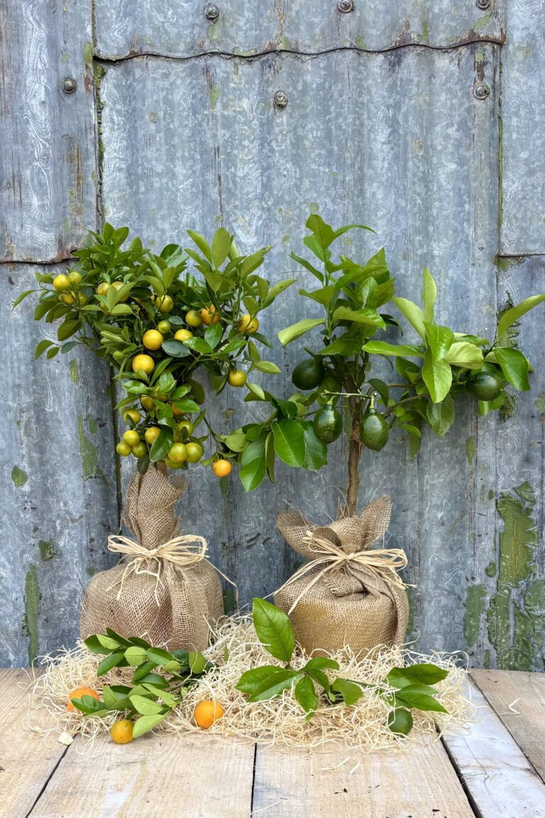 Celebrate retirement with a special and luxurious gift – a pair of hessian-wrapped, fruiting citrus trees.