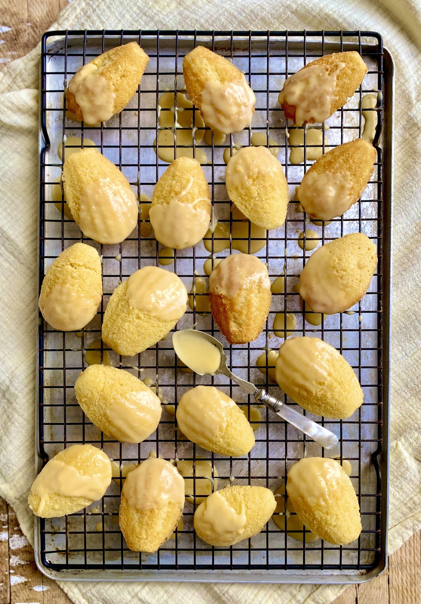 - To make the icing, combine the passion fruit juice with icing sugar into a smooth, dropping consistency. To ice the cooled cakes, either drizzle icing over each one, or dip the tip of the madeleines into the icing bowl before placing on the cooling rack to set. Decorate with the reserved seeds if desired.